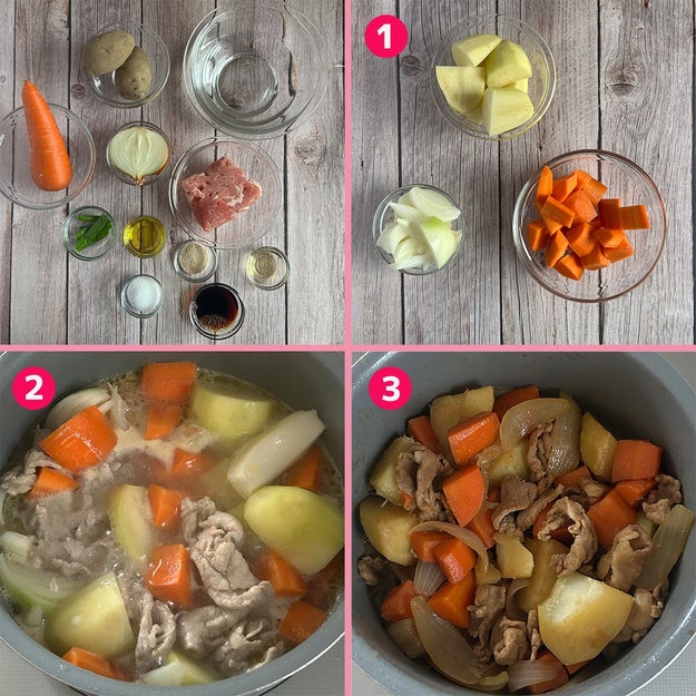 ① じゃがいもは皮をむいて一口大に切る。玉ねぎは皮をむいてくし切りにする。にんじんは皮をむいて乱切りにする。