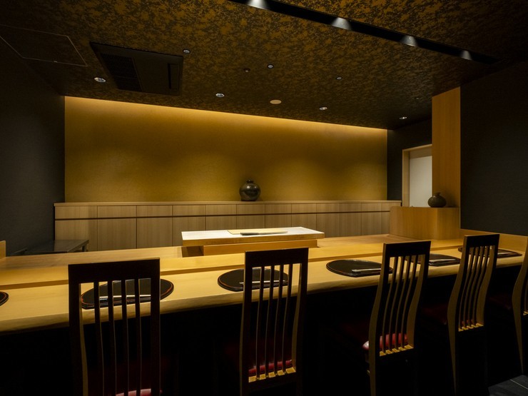 築100年以上の町屋を改装した店舗は、金沢市の伝統的保存建造物に指定されています。店内は、カウンター席6席と4名用のテーブル席のみで、いずれも1日1組限定の完全予約制。カウンターには、2000年前の神代木が使われ、調度品や掛け軸、屏風には古美術を用いるなど、まるで美術館にいるような歴史と趣を感じる空間で、贅沢な時間を過ごすことができます。
