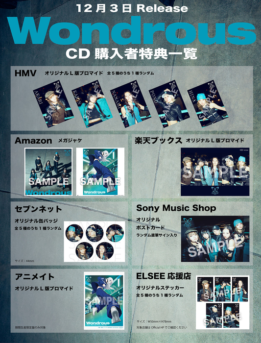 また、12月3日(水)発売ELSEEのメジャーデビュー曲「Wondrous」のストア別CD購入特典の絵柄も解禁となり、アニメ書き下ろし絵柄とELSEEビジュアルによるWジャケットの期間生産限定盤、メンバーフォトブックレット入りの通常盤の2形態でリリースとなる。それぞれにはメンバーのトレカが封入され、豪華特典が用意されたCDショップチェーン別での予約も受付中となっている。