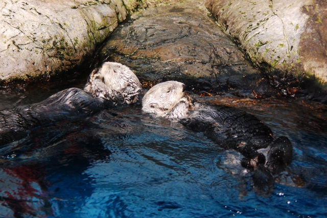 野生のラッコの場合、海藻(ジャイアントケルプなど)を体に巻き付けて眠ることが多いようですが、水族館のように海藻がない環境では手をつなぐ姿が観察されています。