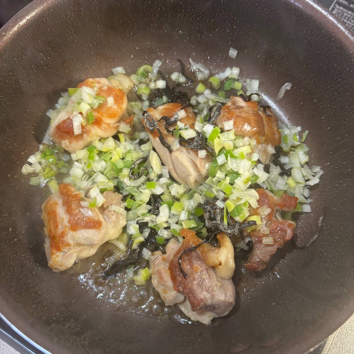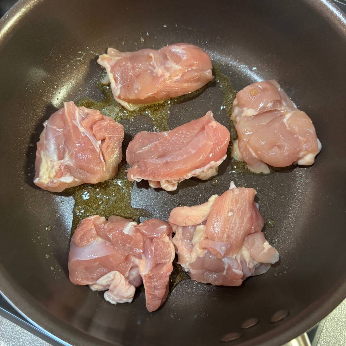 熱したフライパンに油を引き、鶏もも肉を皮目から焼きます。