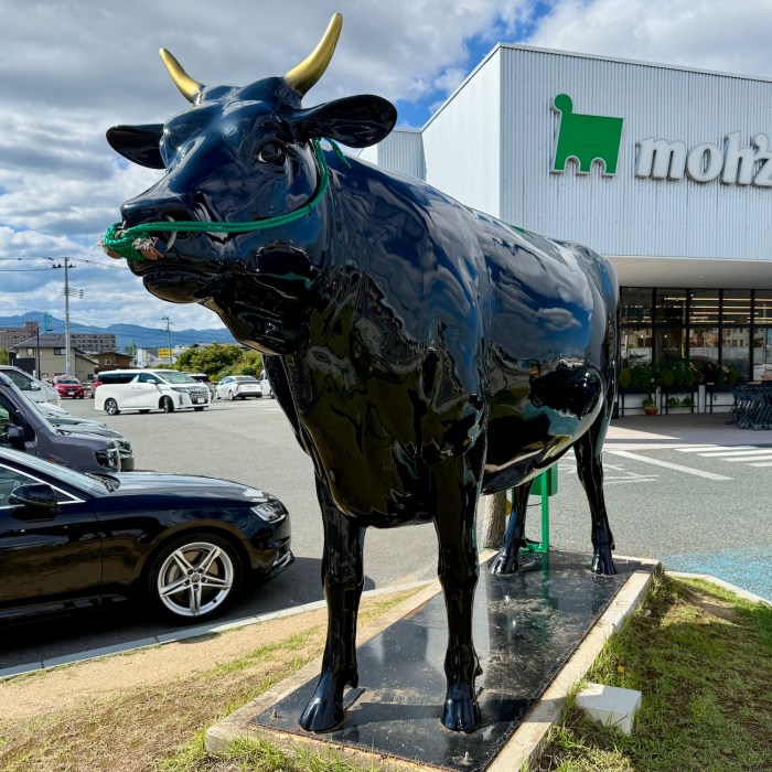 駐車場に鎮座していたのは、同店のシンボルともいえる巨大な牛のオブジェ。車を降りた瞬間から、普通のスーパーではないことが分かる。近づいてみると迫力はMAXで、肉のテーマパークに来たようなワクワク感を覚えた。