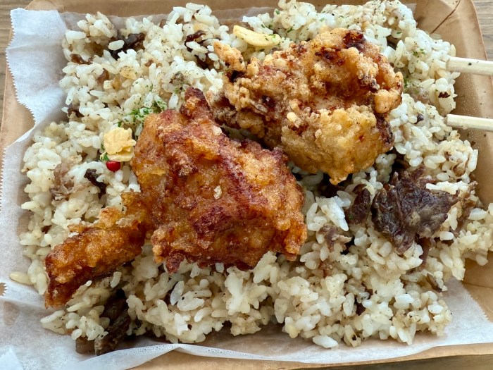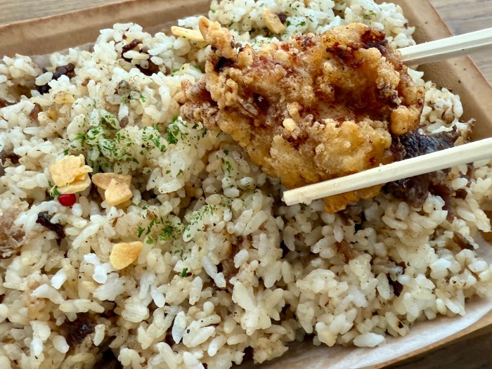 さらに惣菜コーナーで「唐揚げ」も購入。醤油だれは山形県民が愛する甘じょっぱい味だそうだ。こいつをビーフガーリックライスに乗っけたら完成。さっそく食べてみると……