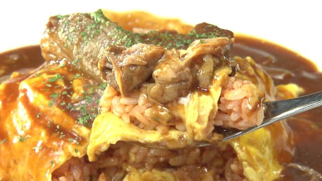 中のごはんはケチャップライス。卵はふわふわ、しっかり味がついたケチャップライスとビーフシチューの組み合わせが最高。