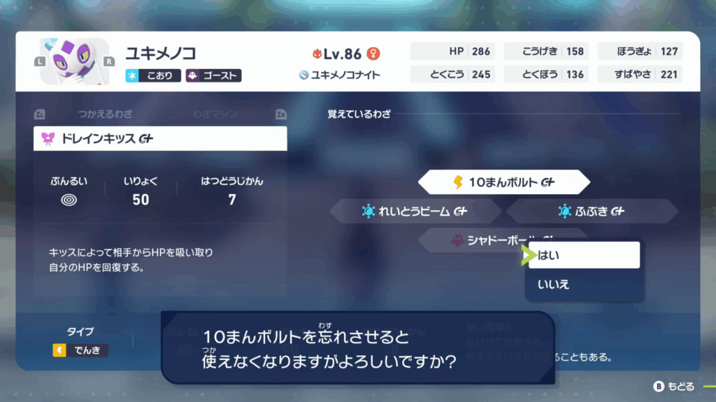 上記画像のような警告画面が出るので、技変更の際は必要な技は消さないように心がけ 画面を注視しておく必要があります。