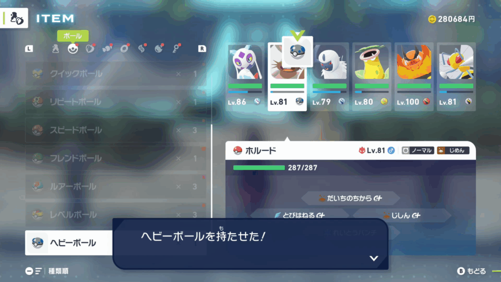 インベントリにないボールはボール選択画面に出てこなくなるので、貴重なボールを誤って投げてしまうのが怖い方は、適当なポケモンにボールを持たせてボックスに預けておくことで対策が可能です。