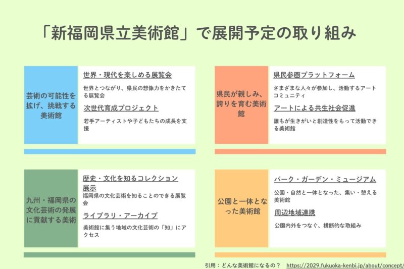 先にお伝えした4つのコンセプトを実現するために、新福岡県立美術館では、以下の取り組みが予定されています。