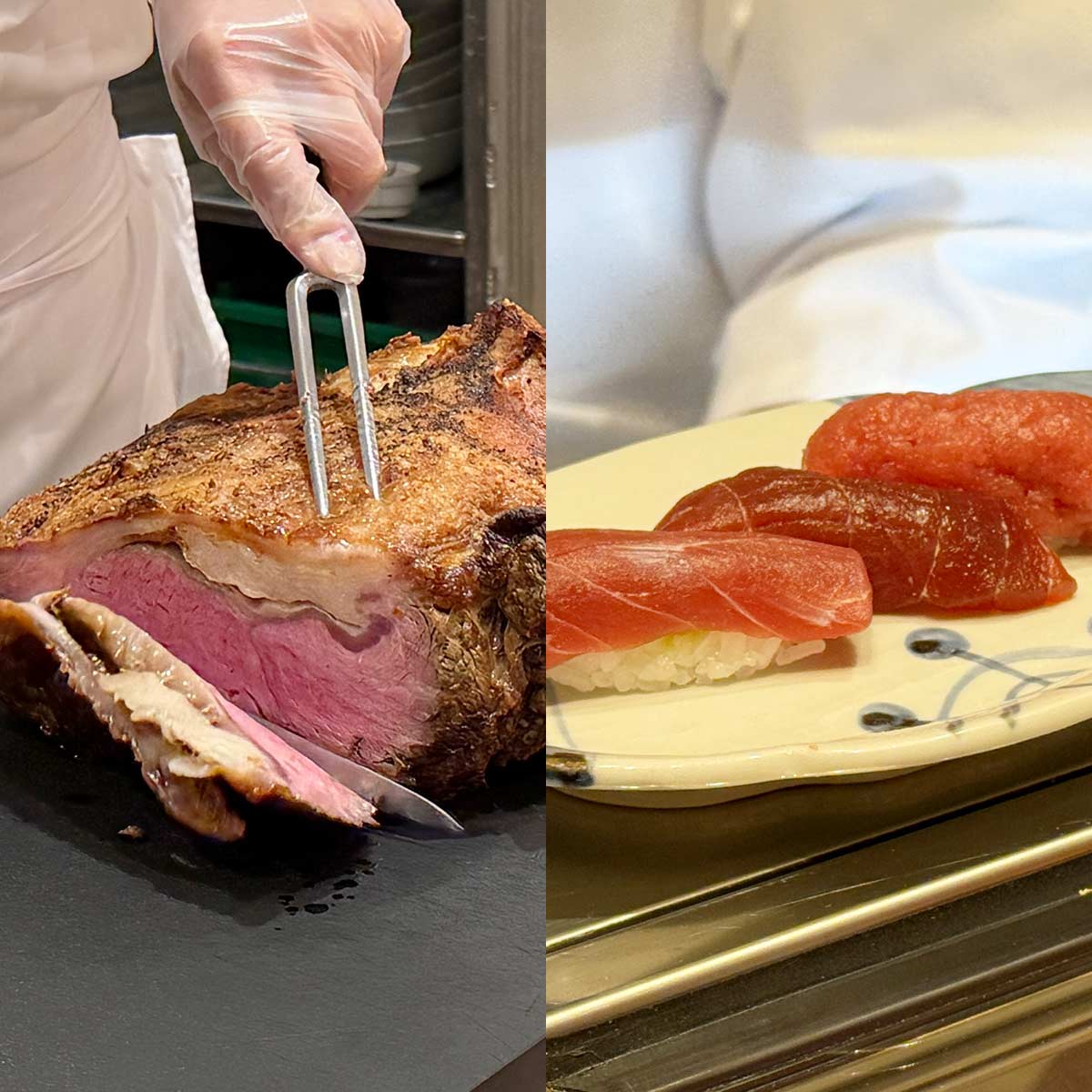 目の前で握る寿司、レアに仕上げたマグロステーキ丼、白子の濃厚なムニエルのほか、牡蠣、サーモン、エビなど海鮮尽くし。さらに、定番のローストビーフや美麗スイーツも楽しめます。