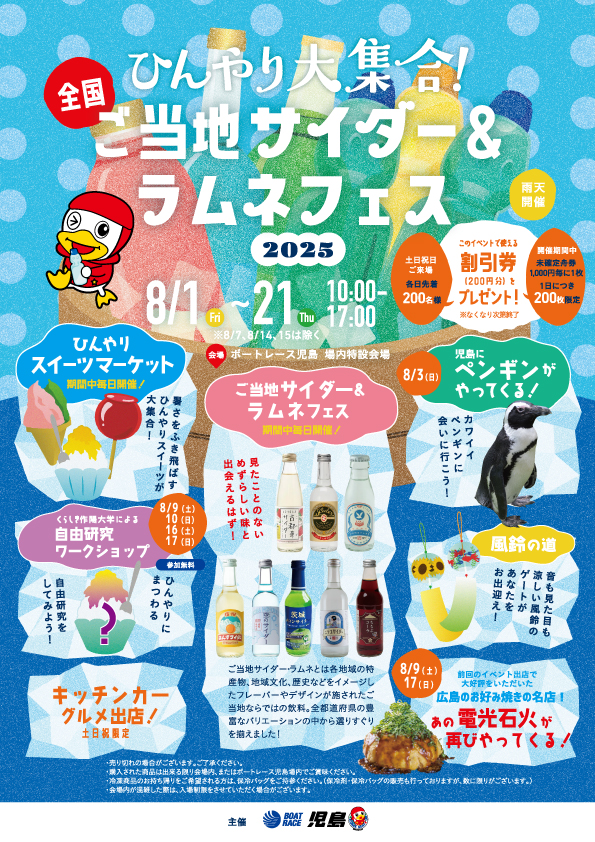 ひんやり大集合!ご当地サイダー&ラムネフェス(2025年8月1日〜21日開催)~ 全国各地の炭酸飲料でシュワッと涼しむ、ボートレース児島の夏