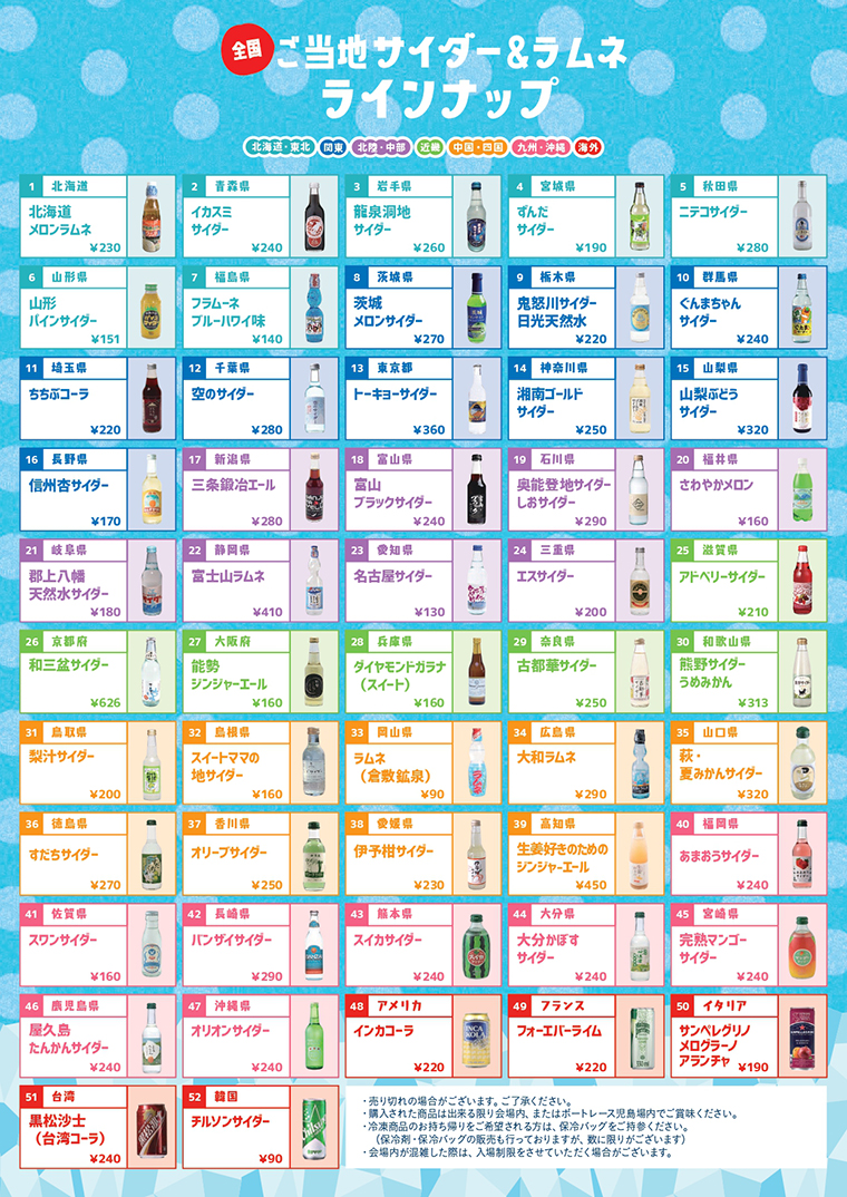 47都道府県と海外5か国の全52種類のご当地サイダー・ラムネが一挙に集結し、現地に行かないと手に入らないレアな炭酸飲料を楽しめるイベントです。