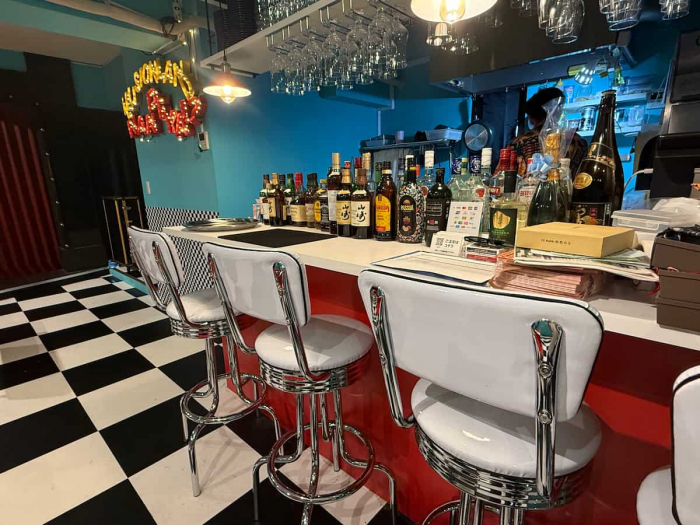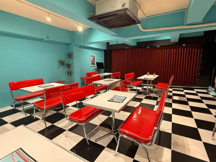 無事にドアを見つけて中に入ると、目の前に広がるのはアメリカンな空間。赤いレトロチェアと白黒の市松模様の床、ターコイズブルーの壁が、まるで1950年代のアメリカンダイナーのようなポップでレトロな雰囲気を演出します。