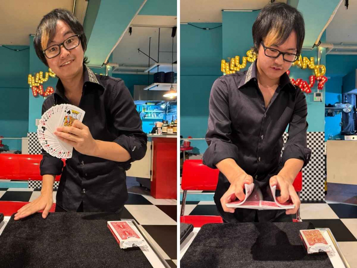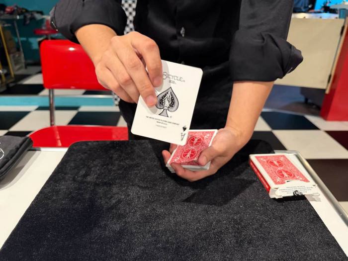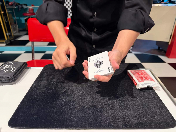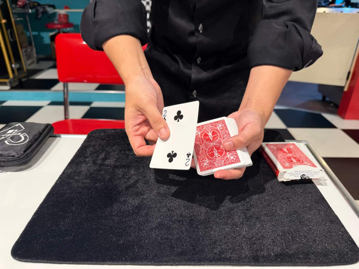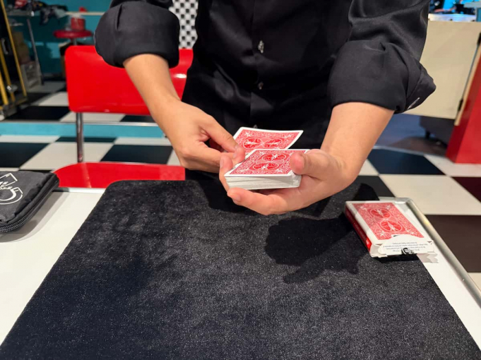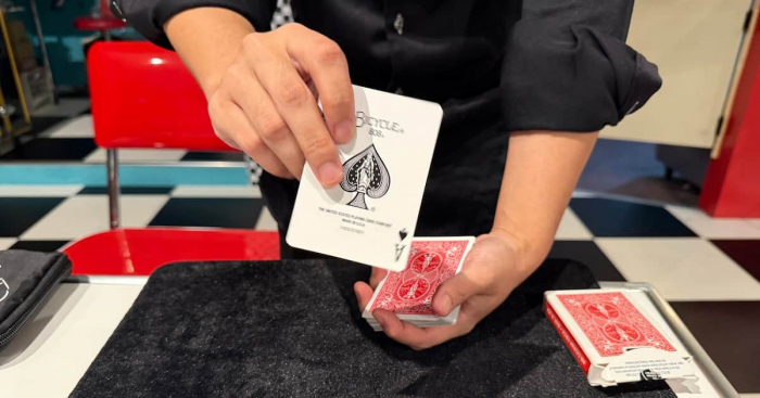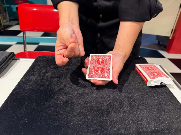 目の前で繰り広げられるテーブルマジックは、瞬きも忘れるほど。Teruさんの手さばきや、一瞬で移動するカードに、「え!?なんで???」と驚きの声が連続!笑いと拍手が止まりません。