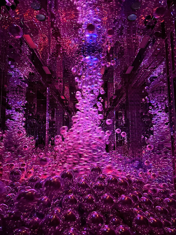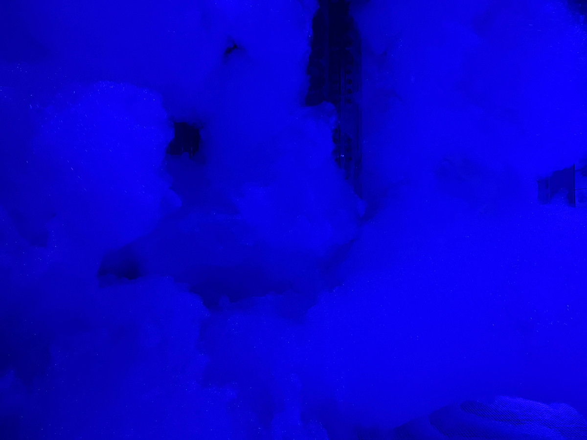 代表作のひとつ《質量も形もない彫刻》は、アラブ首長国連邦の「チームラボフェノメナ アブダビ」で公開されたもので、日本初登場となる。泡で満たされた空間から巨大な塊が生まれ、中空に漂いながら形を変え続けるインスタレーションだ。