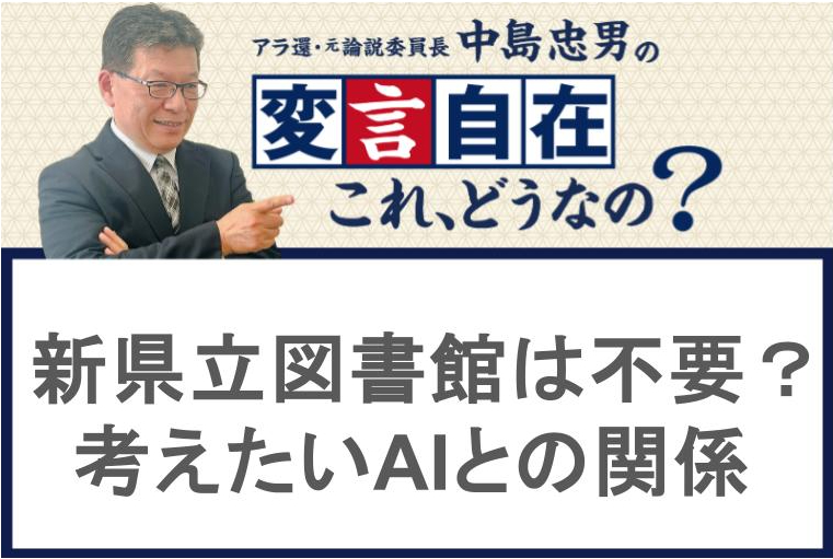「開架棚で本を探し、ページをめくるのはコスパ、タイパが悪い」「貴重資料の保存も公開も全てデジタル化すればハコモノの図書館はいらない」と考えますか。これはノートと鉛筆、黒板とチョークを手段に先生が児童生徒と向き合ってきた学校での教育活動は、全員配布のタブレットで置き換えることができるのか、の議論にも通底します。図書館の将来像を考えることは情報化社会と私たちの暮らしを立ち止まって見直す機会になります。中島 忠男(なかじま・ただお)=SBSプロモーション常務