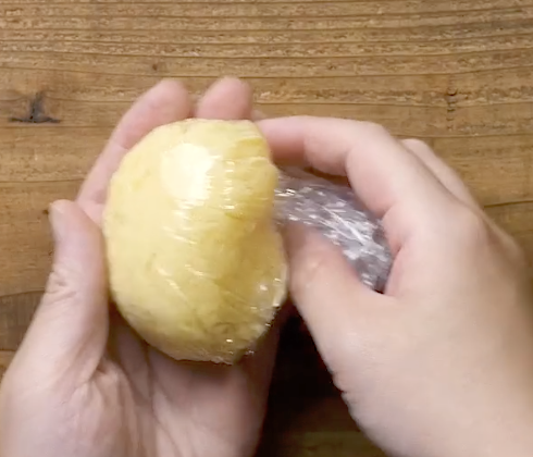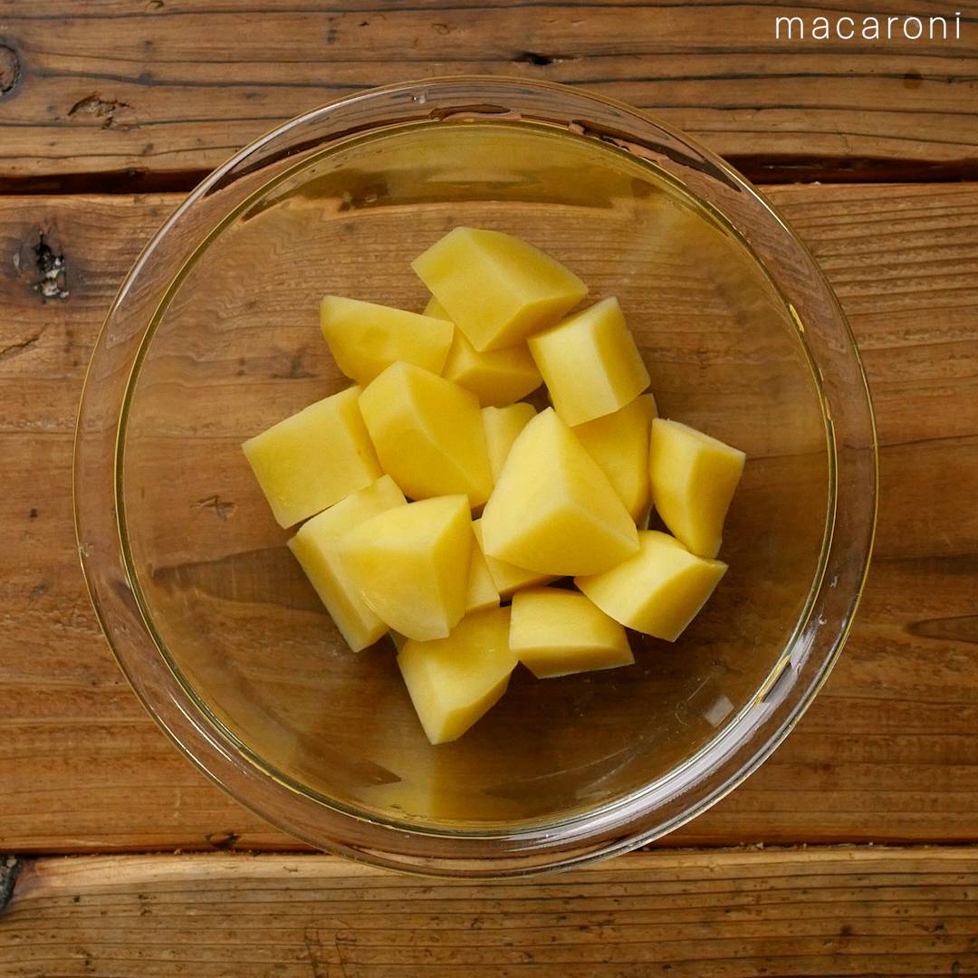 1: ボウルにじゃがいもを入れてラップをかけ、レンジ600Wで5分加熱します。