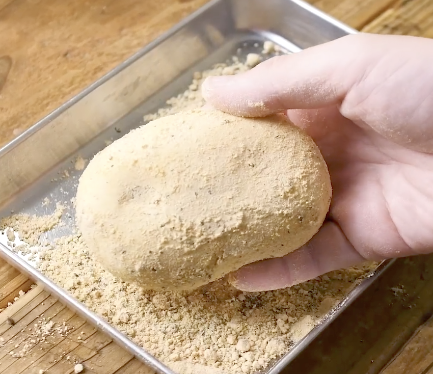 6: ③を包みます。きなこと黒すりごまをまぶし、指でへこみを作りながらじゃがいもの形に整えます。