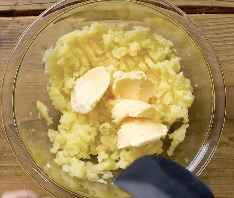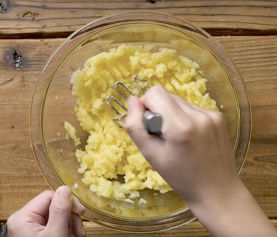 2: 取り出したら熱いうちにマッシャーでつぶします。