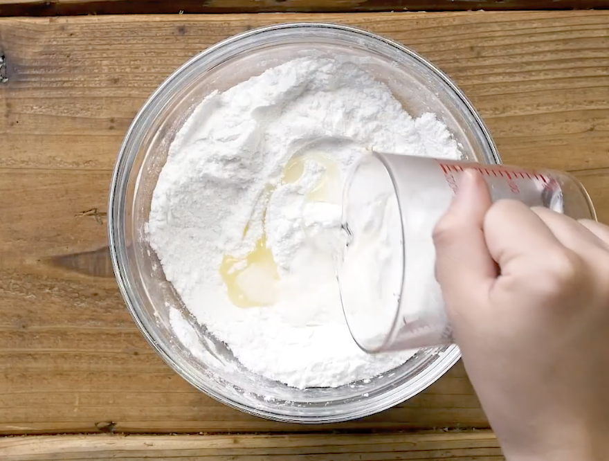 4: ボウルに製菓用米粉、片栗粉、砂糖、塩を入れて混ぜ合わせます。米油、熱湯を加えてゴムベラでこねます。生地が均一になったら4等分にして丸めます。