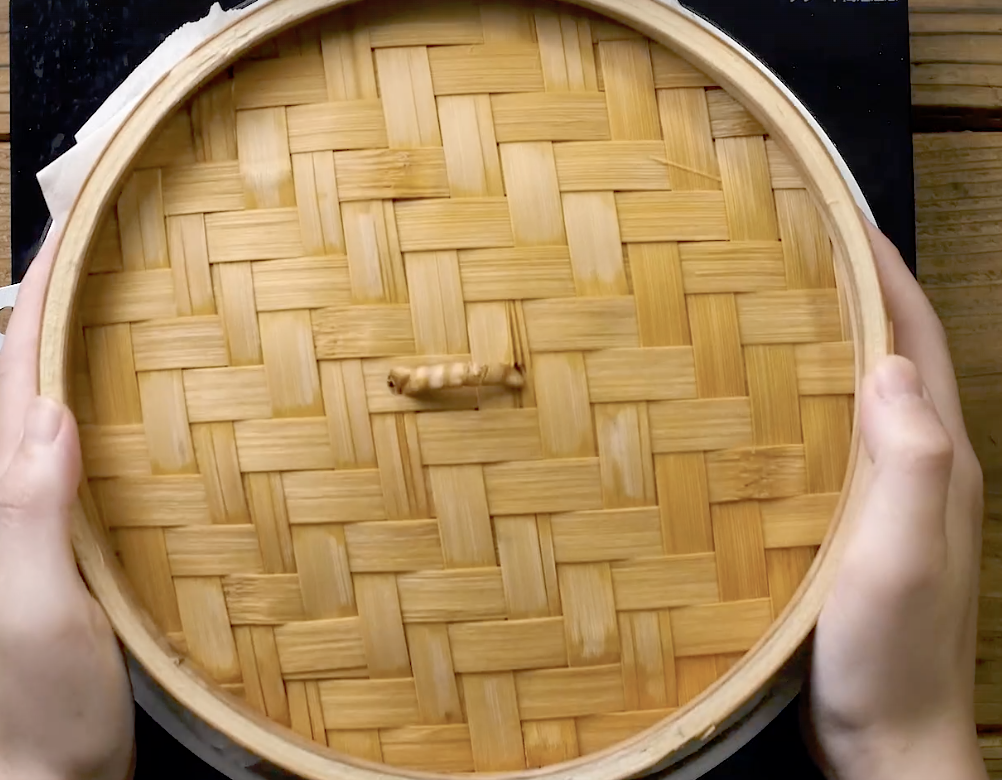 7: クッキングシートの敷いたせいろにのせます。鍋から湯気があがり始めたらせいろをのせ、フタをして15分ほど蒸します。