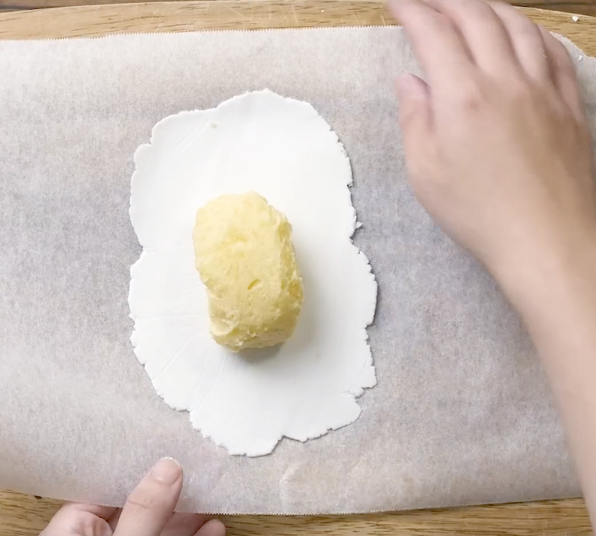 5: クッキングシートの上に生地をおきラップをかぶせます。③をつつめる程度の大きさの楕円形にのばします。(14cm×20cm程度)