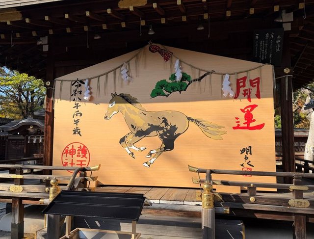 高さ2メートル75センチ、幅4メートル28センチもある大絵馬には、京都市在住の日本画家・曲子明良(まげし あきら)さんが描かれ来年の干支・午(うま)が勇壮に躍動しています。