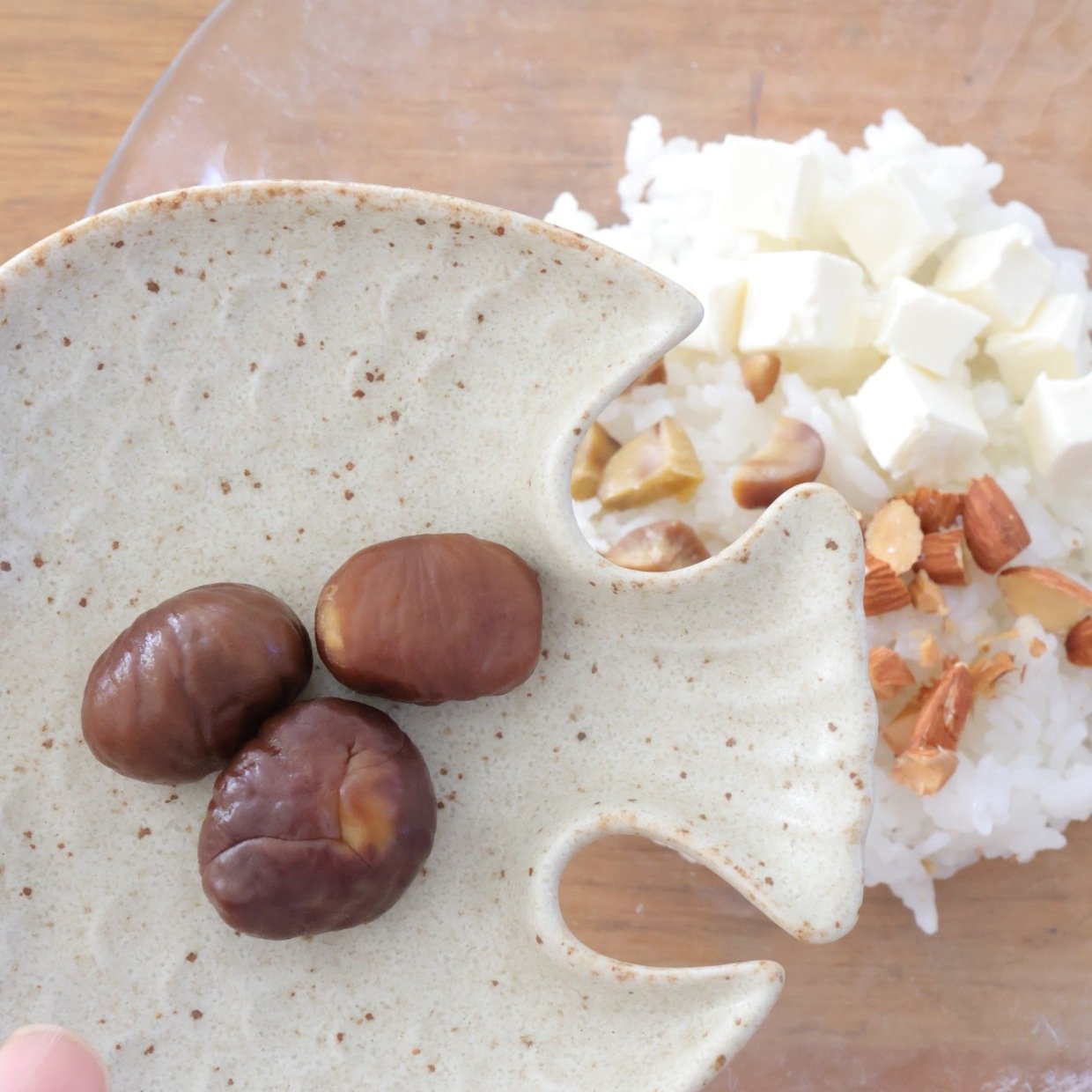 甘栗と一緒にごはんに混ぜ合わせるのは、「クリームチーズ」と「アーモンド」です。やさしい甘みの甘栗に、クリーミーかつ香ばしい風味が添えられ、これはまるでモンブラン⁉︎ ほんのり塩を利かせるのもポイントです。