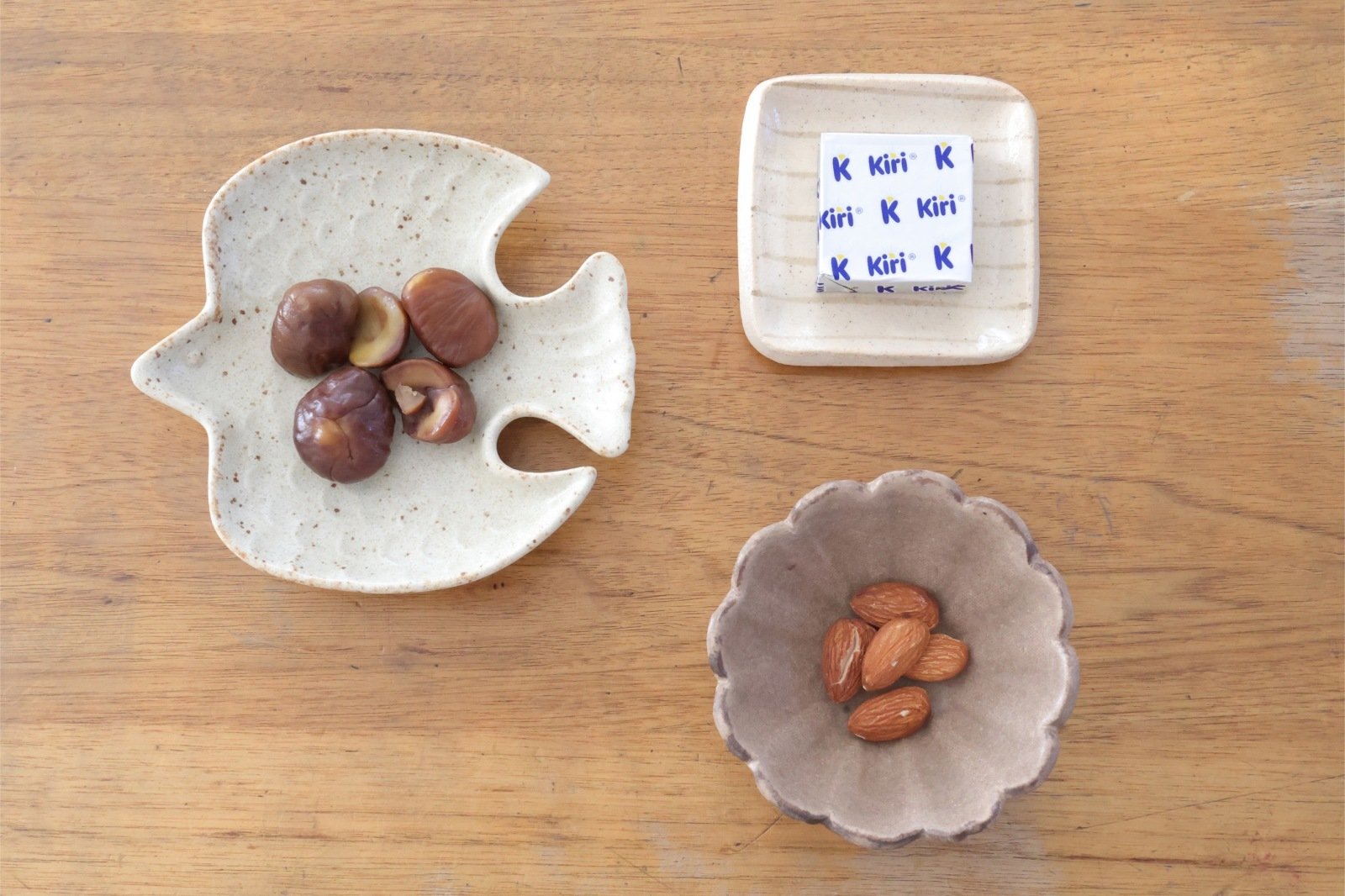 クリームチーズは1cm角、甘栗とアーモンドはそれぞれ小さくカットします。