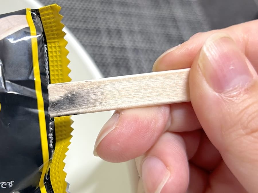 そして最後、食べ終わったあとの棒をなんとなく見てみると、黒が色濃く残っています。普通のアイスでも棒への色移りはありますが、「画材か?」と思うくらいにベッタリ色が残っているのは、黒ならではでしょうか。