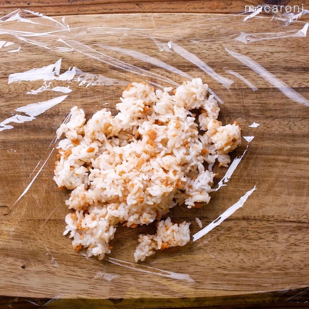 3: ラップを外し、海苔で作った口や目を貼り付けます。