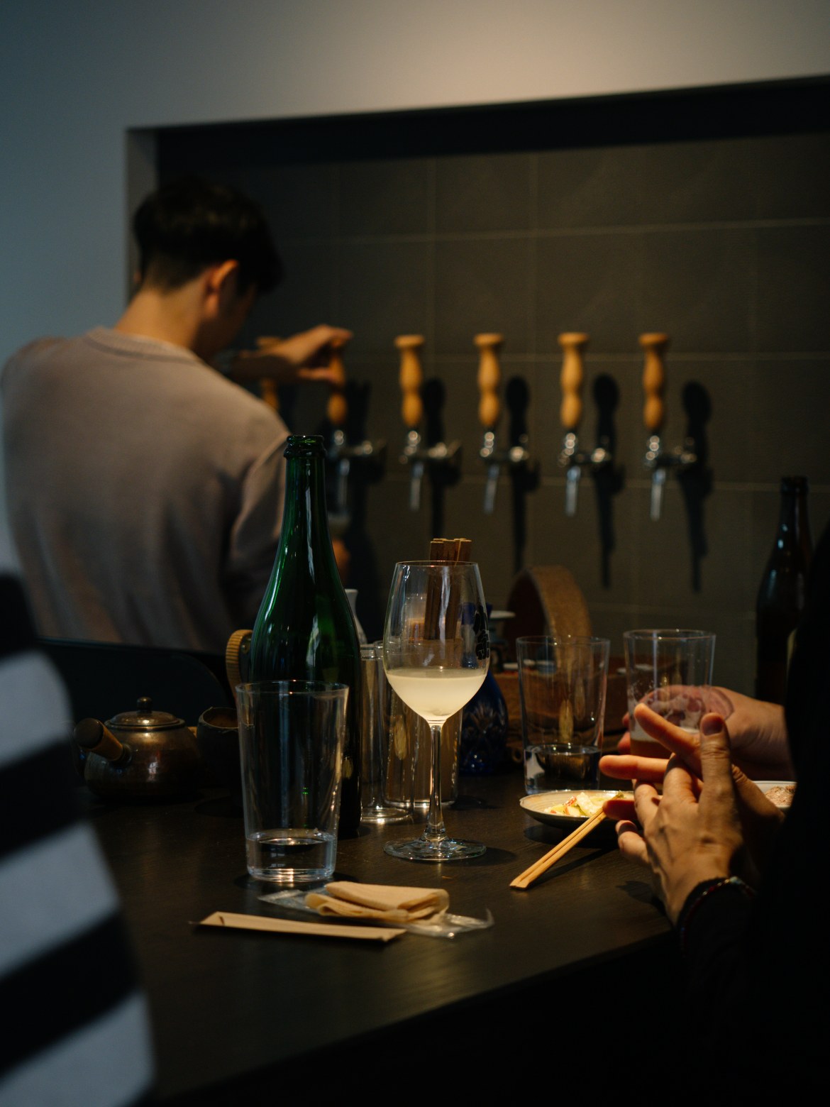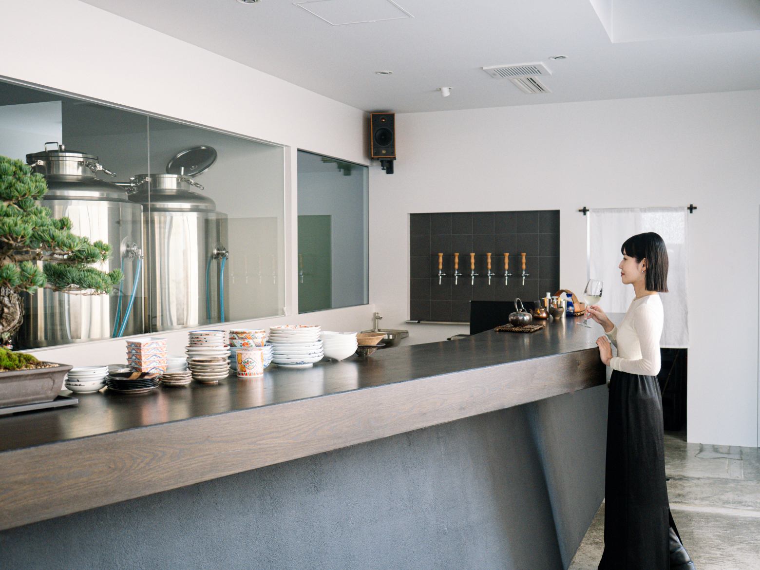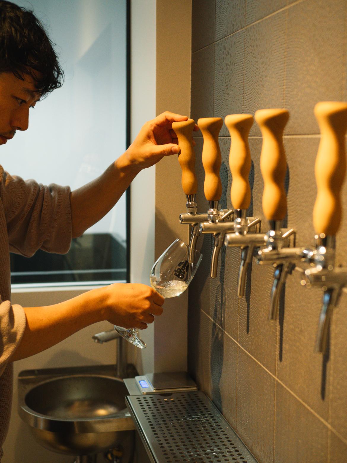 立ち呑みパブでは、タップから提供される出来立てのSAKEを楽しめます。ガラス越しに麹造りや仕込みの様子を見たり、醸造家と直接話せる距離感も、この場所ならではです。