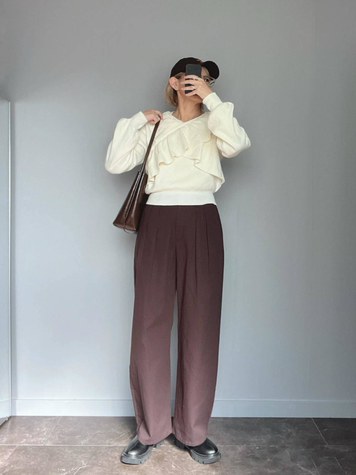 黒トップス×ブラウンパンツの濃色コーデのときは、トップスをボトムスのウエストにタックインすると◎