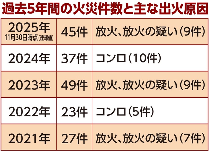 市消防によると、火災の原因は放火・放火の疑いによるものが9件で全体の20%と最も多い。次にたばこによる出火が7件(15・6%)、コンロによる出火が5件(11・1%)。管理課担当者は「前年と比べ、放火は2件、たばこが原因となる出火が4件増えている」と説明。「枯れ葉やごみなど、家の周りに燃えやすい物はなるべく置かないでほしい。ゴミを夜のうちに出す人もいるが、朝出すようにしてほしい」と話す。