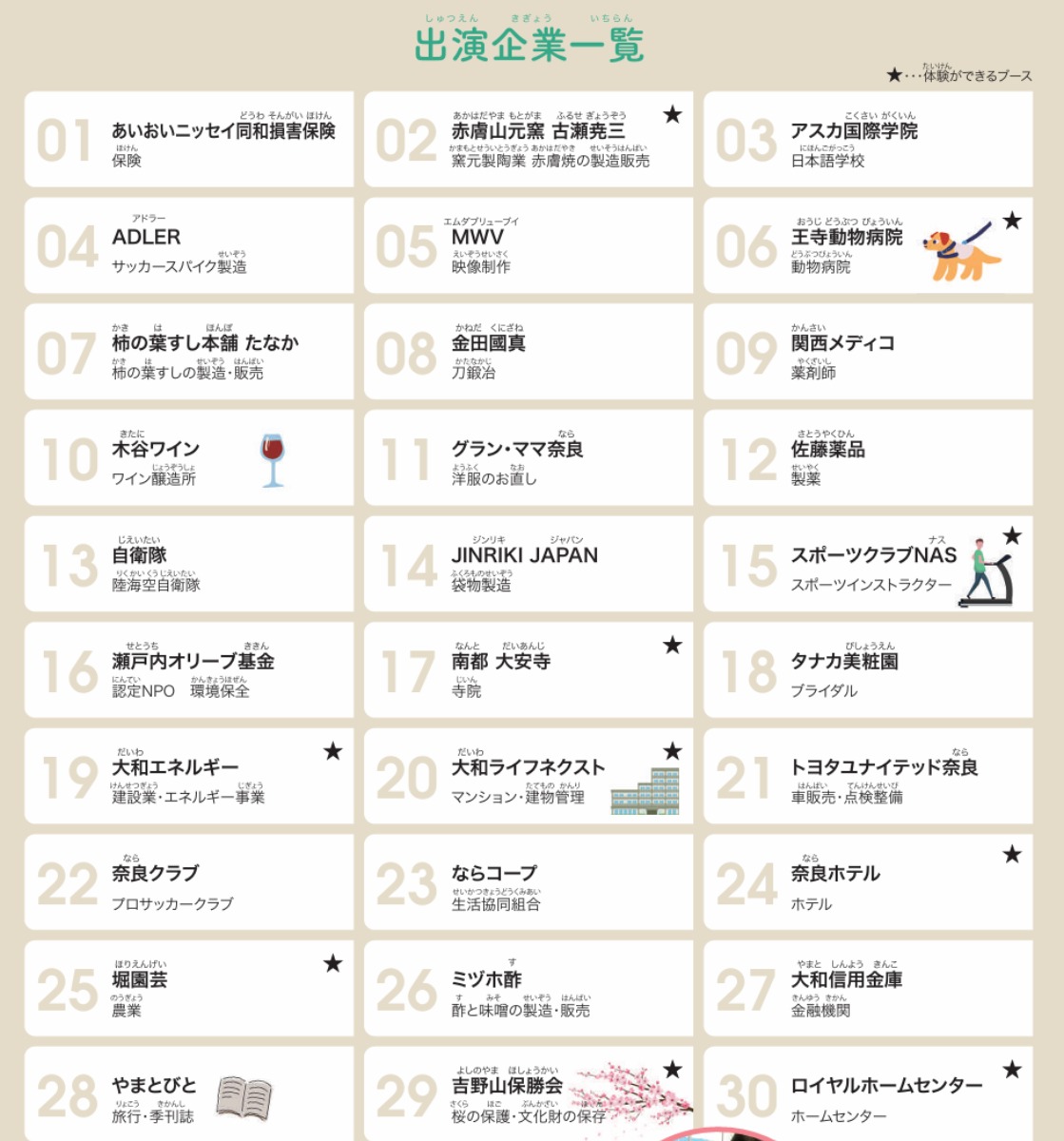 業種が異なる奈良県(※一部除く)に所在地を構える31社が集まりました。各企業の様子を紹介します。