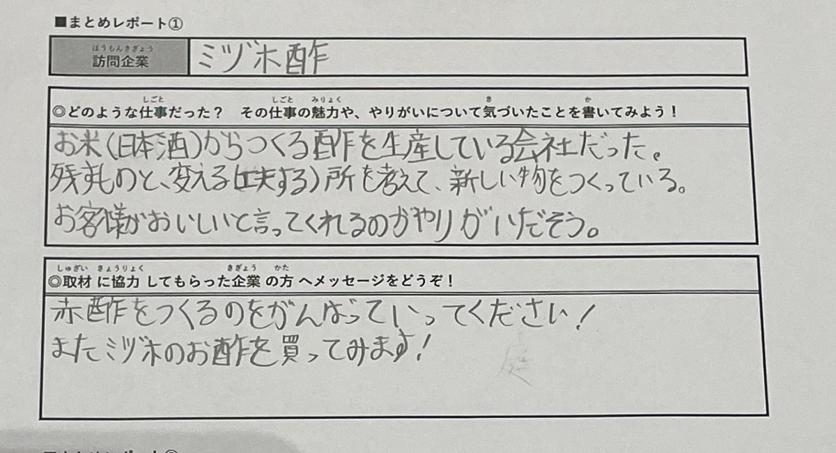「取材先はどんな仕事だった?」「仕事の魅力ややりがいについて気付いたことは?」等、訪問した企業さんのお仕事のお話しや質問、体験を思い出しながらレポートに記入しました。