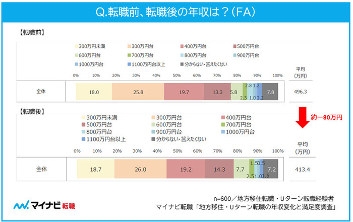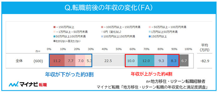 アンケート調査では、地方移住転職・Uターン転職によって平均年収が約80万円ダウンした一方で、約4割は年収が上がったという結果も出ています。
