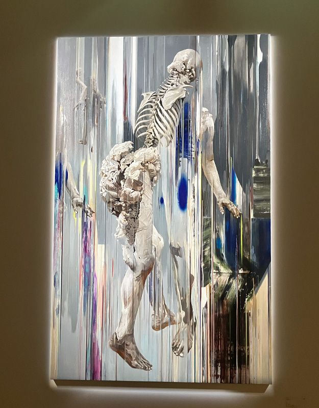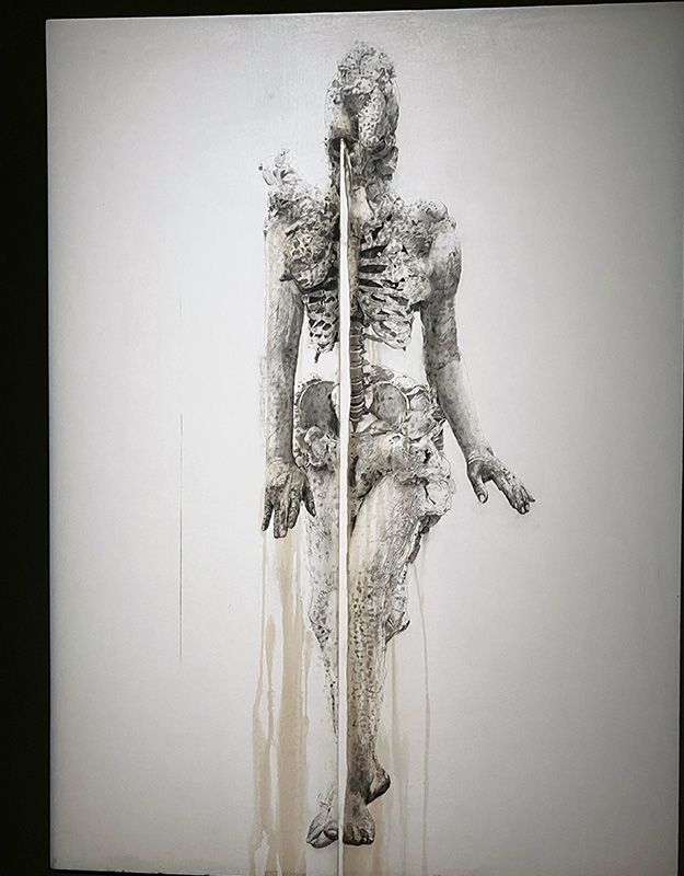 頭蓋骨を持つ女性像、頭部だけが骨になったキリン、豆腐の柔らかさを描いた静物画。