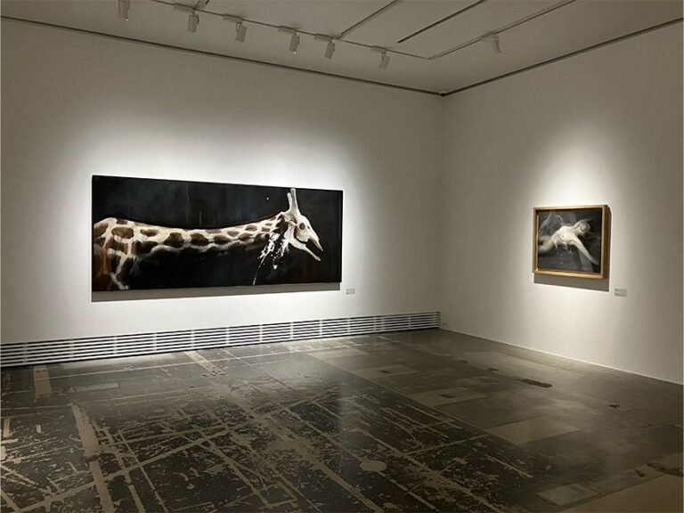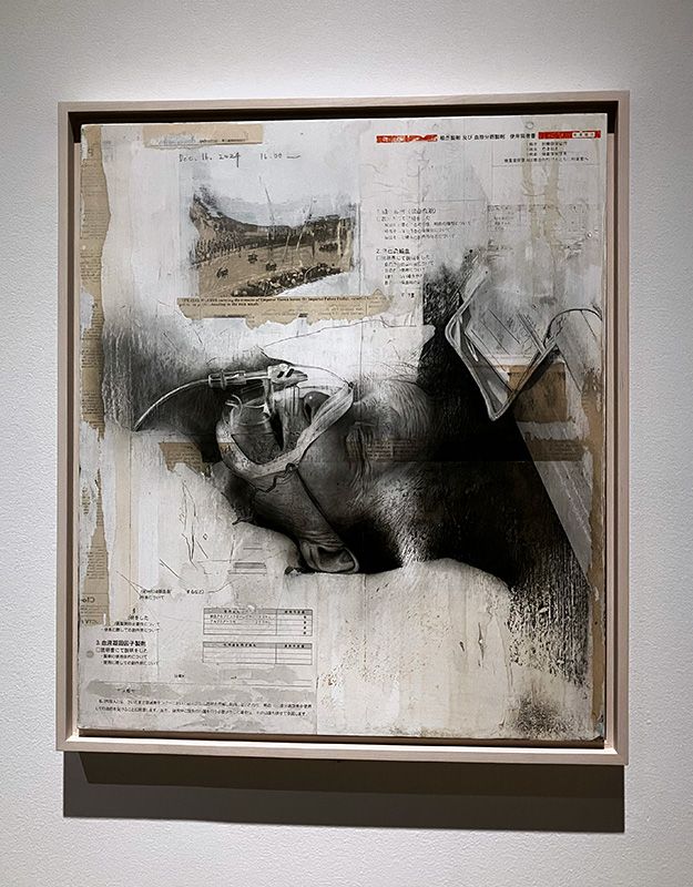 実物大で描かれた、頭蓋骨と生身の体がコラージュされたキリンの絵《Untitled》は、彼が自然史博物館で実際に動物の解剖を見た経験をもとに再構築したもの。