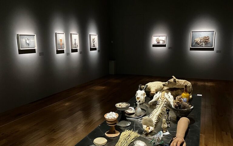 家蚕や十穀を盛った須恵器、熟した洋梨の絵。台の上には、モチーフとなった古い骨格標本や石膏模型が並びます。これらはかつて“生きていたもの”であり、“人と関わっていたもの”でもあります。