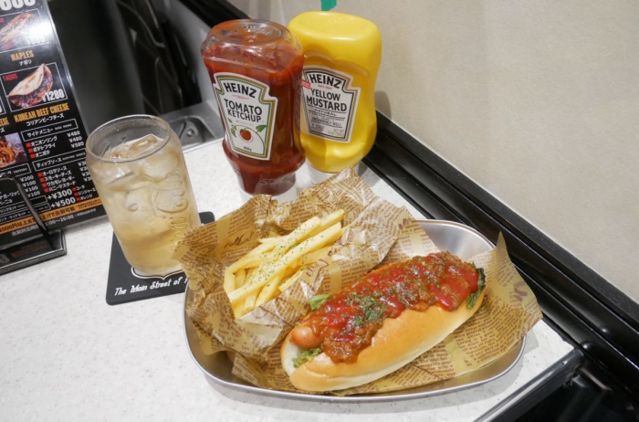 どれも魅力的なメニューで悩んだ末、今回はオーナーさん一押しの「オリジナルミートホットドッグ」を注文!プラス500円でドリンクとサイドがセットになるのもありがたいです。