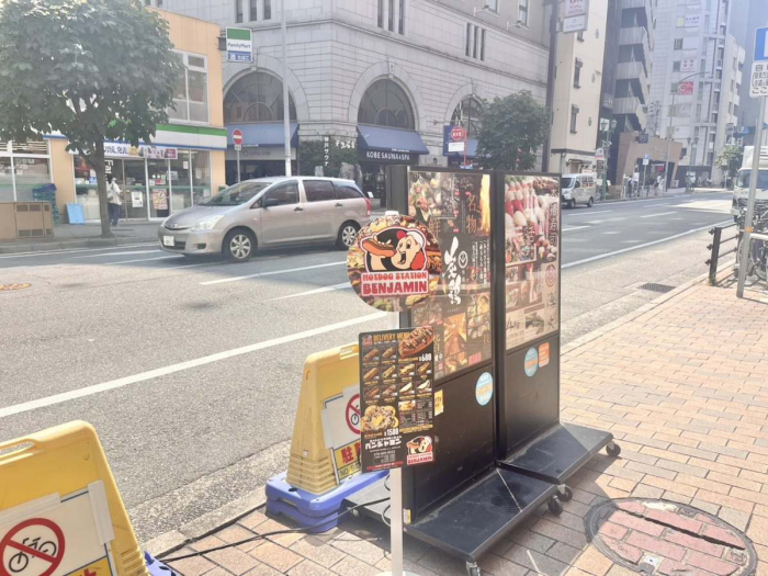駅から徒歩5分ほど、『神戸サウナ』や『ドン・キホーテ』の方へ向かうと、可愛らしいポップなキャラクターの看板を発見!