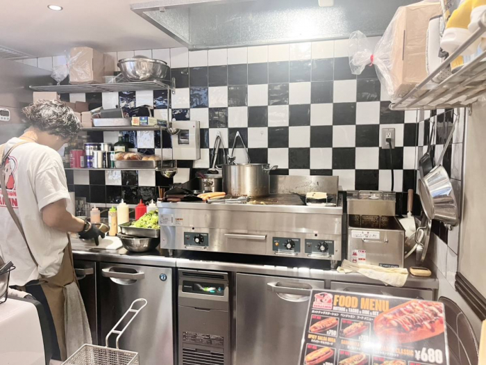 注文が入ってから一つひとつ作られるホットドッグ&タコスは、どれも出来立てのアツアツ状態で提供されます。カウンター席からは調理の様子が目の前で見られるのも楽しいポイントです。
