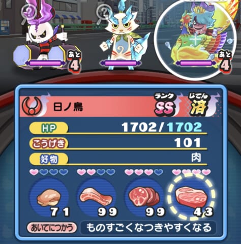 日ノ鳥の好物は肉です。好物を与えて、なつき度を上げましょう。