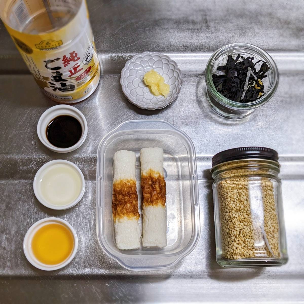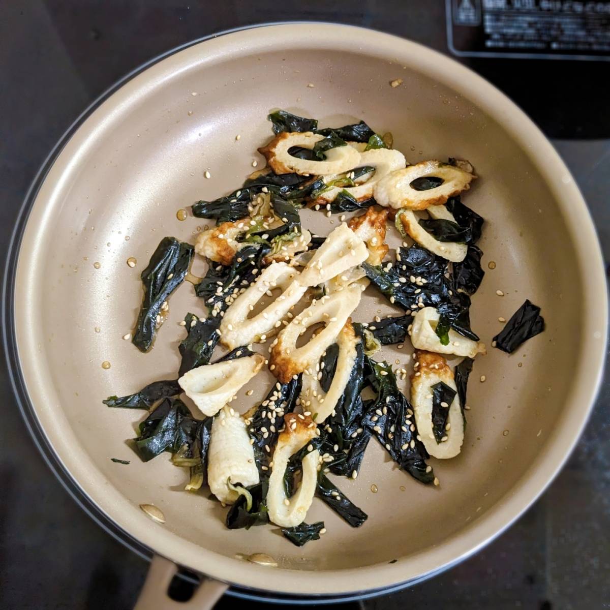 ごま油の半量を熱し、ちくわと海藻を炒めます。