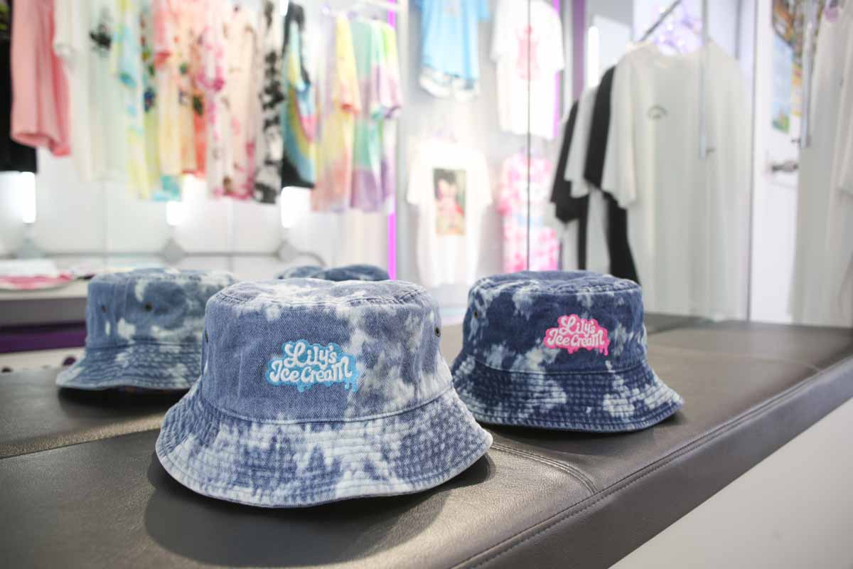 Tシャツやハーフパンツのほかに、キャップやバケットハットも人気なのだそう。 特に、バケットハットはさわやかな色合いがステキで目を引きます。 「ライトデニム」と「ダークデニム」の2タイプがあり、刺繍の色はピンク・紫・黄色・オレンジ・青の5色展開です(画像左:ライトデニム・青、画像右:ダークデニム・ピンク)。 刺繍の“Lily’s icecream”の文字は暗闇で光る仕様になっています。 実際に光っているところを写真で見せてもらったのですが、ほのかに浮かび上がる感じなので、派手すぎず、いい感じです。昼だけじゃなく、夜のお出掛けでもかぶりたくなるユニークなアイデアだなと思いました。