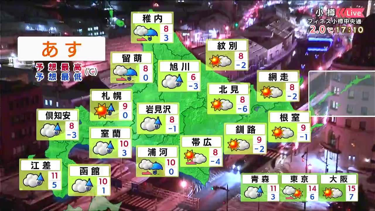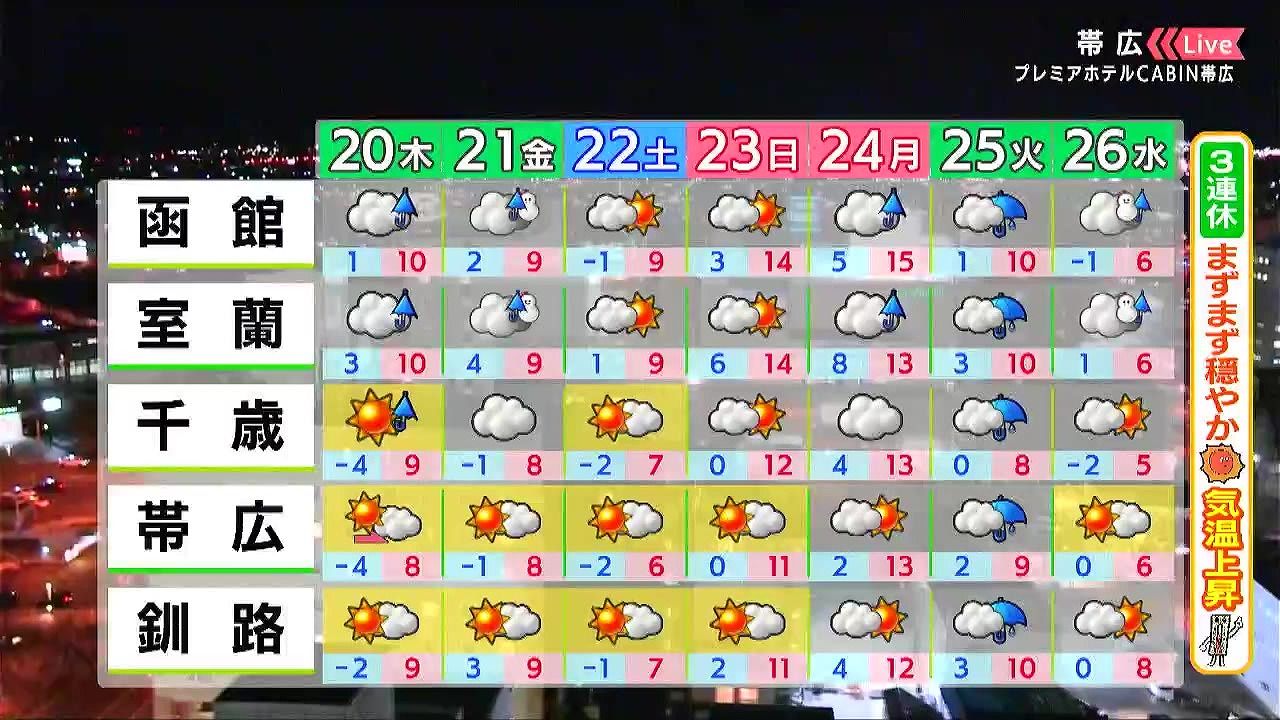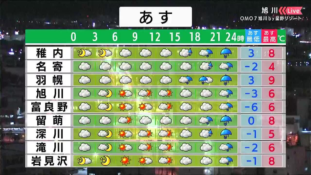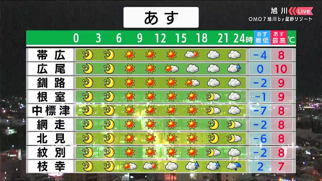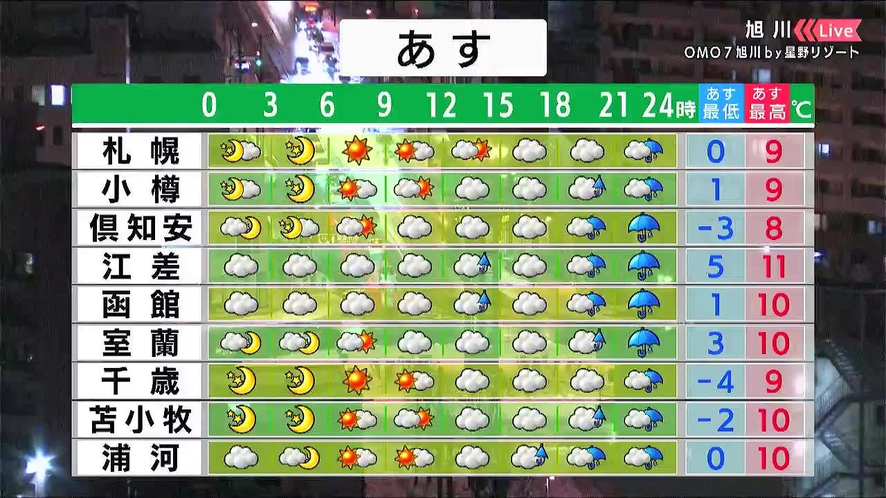 道東方面で晴れる他は、雨の降る時間があるでしょう。最低気温は0度前後で、北見は-6度と冷えます。日中の寒さは緩み、札幌は9度。夜も気温が高いでしょう。