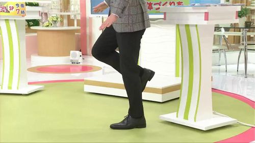 そして「片足立ち」です。前に体重をかけないように真っすぐ立って、軽く片足を後ろに上げます。余裕がある方は、床に付けている足を軽く曲げてみましょう。テレビを見ながらでも簡単にできますよ。