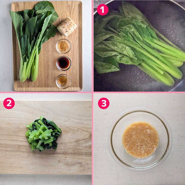 ① 小松菜は熱湯でさっとゆで、冷水にとってしっかり水気を絞る。