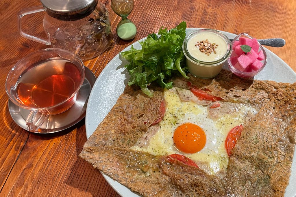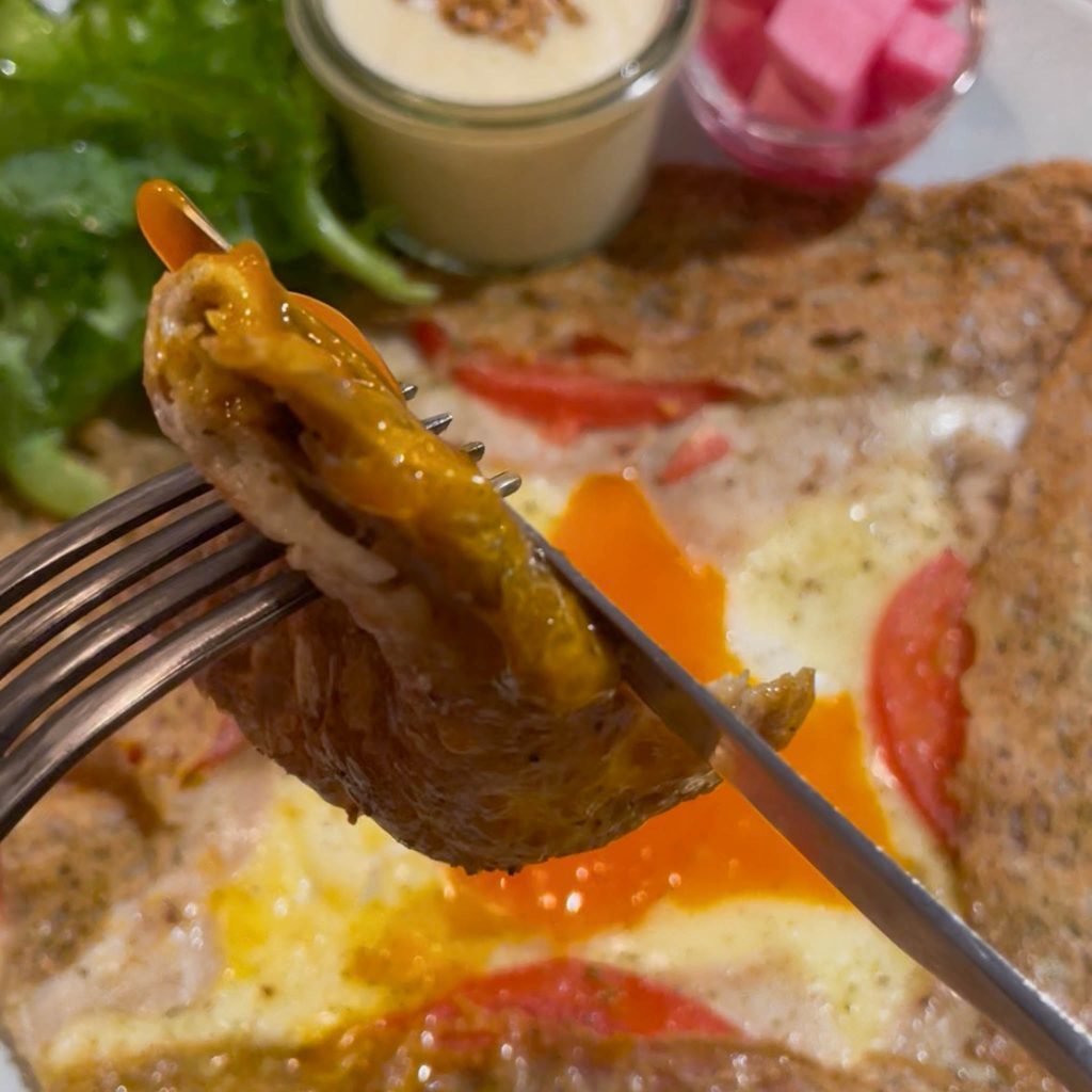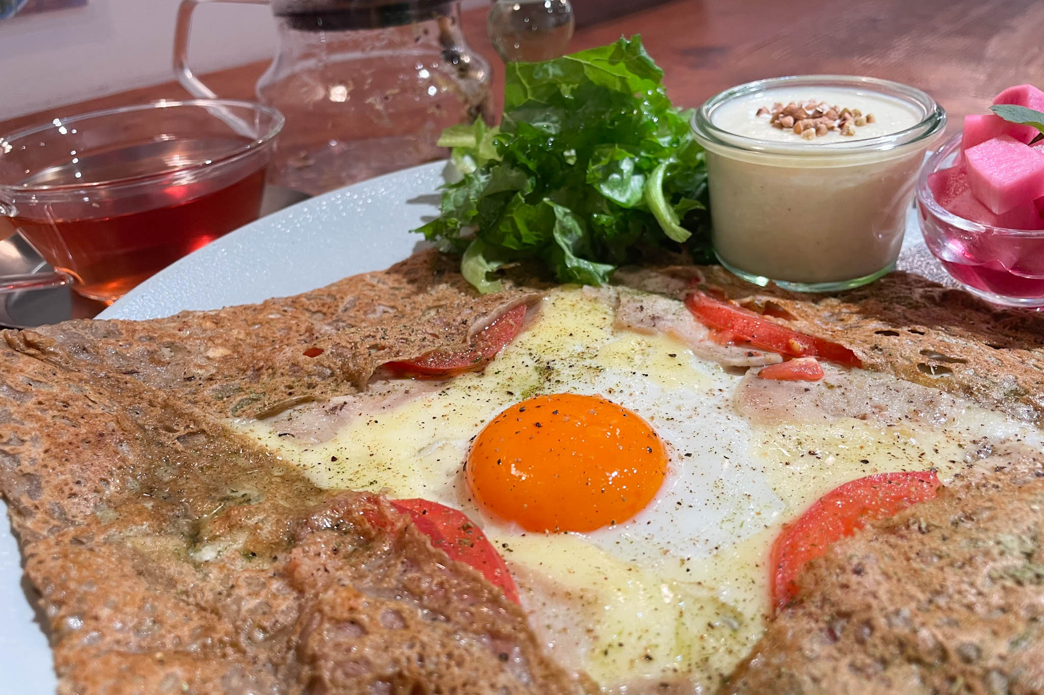 続いてガレット。今回選んだ「コンプレット」は三田ポークの自家製ハムと卵、トマトとチーズのガレットで、生地は香ばしくもっちもち。