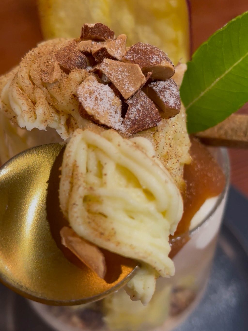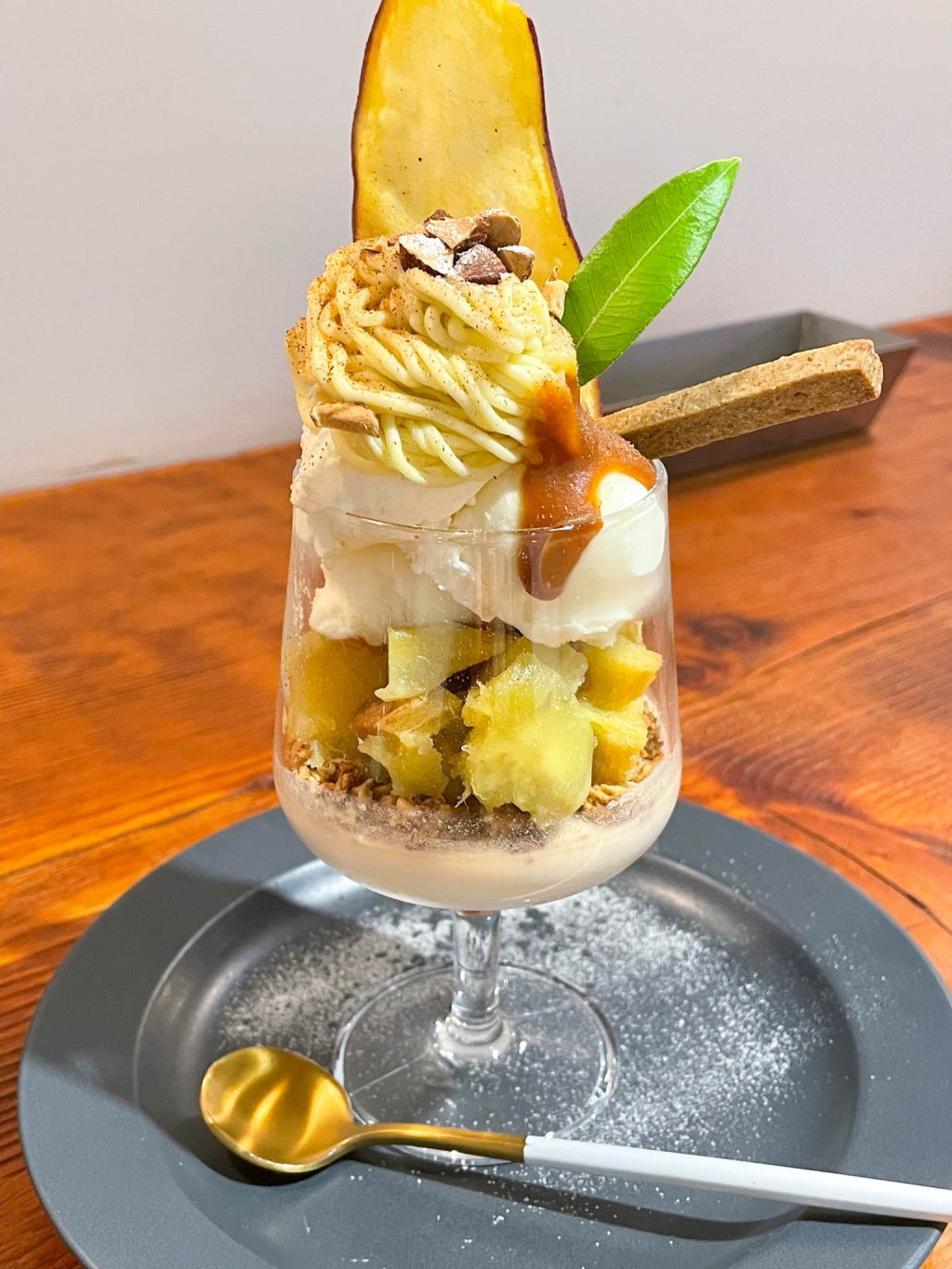 塩キャラメルソースがまた良いアクセントになっていたり、このお芋クリームの柔らかいこと。秋満載の贅沢パフェです!