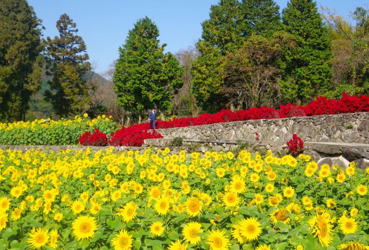 『山田ひまわり園』の魅力は、なんといってもそのロケーション!昔ながらの石積みの棚田一面に咲き誇る約10万本のヒマワリと、背景に広がる鷹取山の豊かな自然。遊歩道や展望台もあり、いろんな角度からヒマワリが咲く秋の風景を眺めることができます。